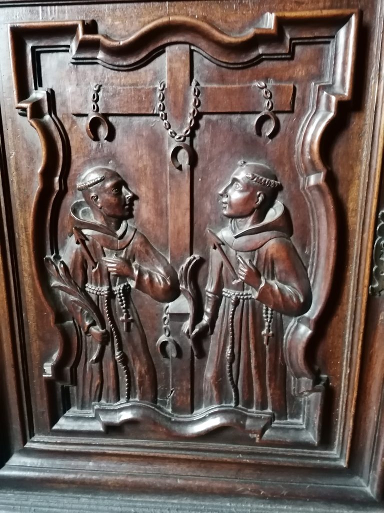 Nei pannelli delle guardarobe e della bussola acquisiti da Chieri, sono rappresentati Santi e Beati dell’Ordine francescano: si distinguono S. Chiara d’Assisi, S. Antonio da Padova, S. Bernardino da Siena e, in basso, S. Paolo Miki e i martiri francescani in terra giapponese. Una rara e interessante iconografia cristiana, di cui ora andrò a descrivere l’origine. Dopo i tentativi messi in atto da S. Francesco Saverio, numerosi missionari gesuiti sbarcarono in Giappone; Nagasaki, nel sud del Paese, divenne il centro della cristianità nipponica. Il Giappone, dopo un lungo periodo di crisi politica, nel corso del XVI secolo iniziò un processo di ricostituzione dell’unità dello Stato e di riassetto istituzionale ed amministrativo, grazie anche a capi politico-militari come Hideyoshi. Nella presenza cristiana al Sud del Giappone, Hideyoshi vide un potenziale pericolo d’invasione da parte di Portoghesi e Spagnoli tramite l’opera dei missionari di quelle nazioni. Nel 1587, Hideyoshi emanò un editto di proscrizione di tutti i missionari, che così avrebbero dovuto lasciare il Paese. Nel 1593, sei anni dopo l’allontanamento dei Gesuiti, arrivarono in Giappone i Francescani che, grazie ai loro metodi di evangelizzazione già sperimentati in più occasioni, crearono nuovi timori in Hideyoshi. Un grave incidente diplomatico fu causato dal capitano della nave spagnola Felipe, arenatasi sulle coste nipponiche. Per tentare di salvare il carico, il comandante mostrò una mappa che descriveva i possedimenti spagnoli nel mondo e descrisse i missionari come una forza preparatoria alla conquista del Paese. Alla fine del 1596, Hideyoshi intervenne pesantemente, ordinando l’arresto e l’esecuzione di missionari e cristiani. Il 9 dicembre, furono arrestati sei francescani (Pietro Baptista Blasquez superiore della missione, Martino dell’Assunzione, Francesco Blanco, Francesco de San Miguel, Filippo di Gesù, Gonsalvo Garcìa); il 26 dicembre seguirono la stessa sorte tre Gesuiti (Paolo Miki e i catechisti Juan de Goto e Giacomo Kisai). Paolo Miki era nato a Kioto da un samurai convertitosi al cristianesimo. I prigionieri, a cui furono aggiunti diciassette laici, tra cui tre fanciulli (Ludovico Ibaraki, di 12 anni, Antonio Cheng di 13 e Tommaso Kosaki di 15), si abbracciarono in segno di riconciliazione e si chiesero vicendevolmente perdono per le dispute che li avevano divisi; furono mutilati di parte dell’orecchio sinistro poi, caricati a tre a tre su carri, attraversarono le città di Kioto, Osaka e Sakai sopportando un tormentoso viaggio di più giorni, nel crudo inverno giapponese, fino a Nagasaki. La sentenza, scritta su una tavola e portata da un banditore, precedeva il corteo dei martiri. Giunti a Nagasaki, furono crocifissi su di una collina, ben visibili dal porto di approdo delle navi europee. Furono fissati alle croci con cinque anelli: uno alla gola, due ai polsi e due alle tibie; tra le ore 11 e mezzogiorno, i carnefici trafissero il loro petto con le lance. Paolo Miki e i martiri ( di Nagasaki furono beatificati il 14 settembre 1627 da Papa Urbano VIII e canonizzati da Pio IX nel 1862.